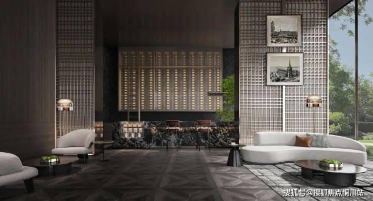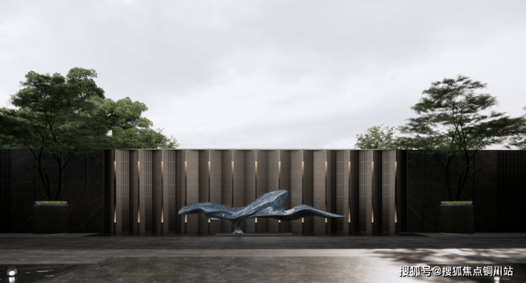 武汉101的大门两侧是,爱马仕灰天然石材铺贴的墙面,中间是定制纯铜岩板,顶部是蓝灰色、高反玻璃搭配古铜拉丝的金属格栅。它将是武昌“第一豪门”。