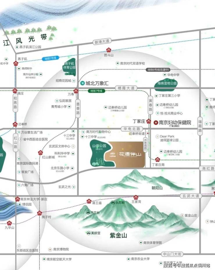 紫金山作为南京城市绿肺,其周边住宅开发长期受限。项目所在的丁家庄片区,是紫金山北麓唯一完成大规模城市更新的板块,既保留了山体的原生肌理,又通过尧红路、地铁7 号线等交通动脉,实现15 分钟直达新街口的通勤效率。