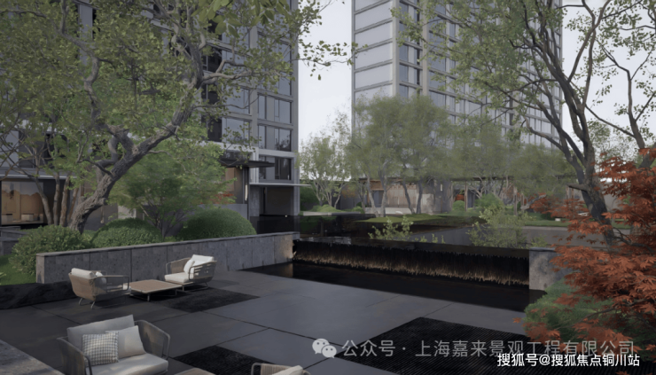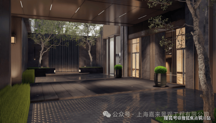 下沉庭院中,五株姿态各异的乌桕、一棵挺拔的羽毛枫与一株稍小些的羽毛枫相伴而立,其间点缀着一棵苍劲的黑松。苔藓覆地,起伏有致,辅以中层大叶植物与零星蕨类,诸般自然元素相映成趣,绿荫葱茏,意境清幽,为业主提供了一处隐秘而雅致的会客天地。