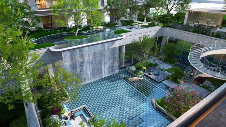 因为一期地块超百亩,留了足够大的空间和资源去做会所、架空层泛会所,给四代宅的“空中庭院”配上了“社区度假村”。