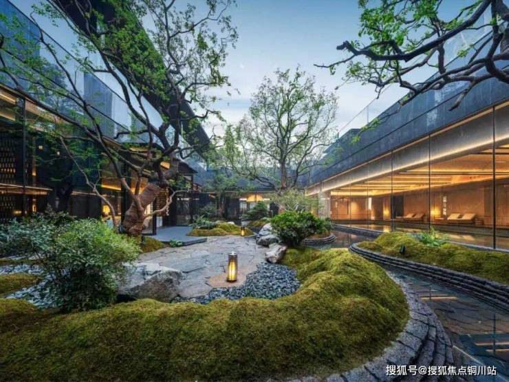 第一个“岛”就在小区大门处。高7米、长77米左右的大门,用墨绿色碧潭金沙石材做墙面,看着古朴又雅致。四周绕着缓缓流淌的活水;天井中央立着一棵90多岁的老朴树。“这里借鉴了徽州古建筑‘四水归明堂’的理念。”