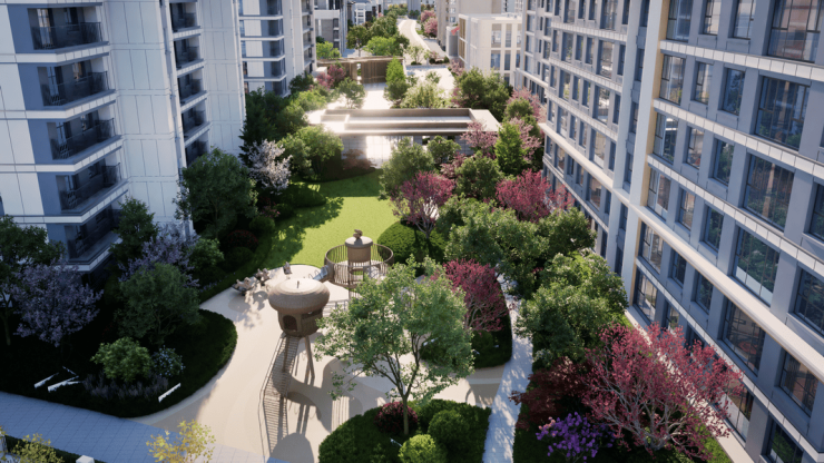 园林以“行望山海,居游艺境”为理念,打造“一轴一核六园”诗意格局,酒店级归家仪式感与自然休闲空间相映成趣。