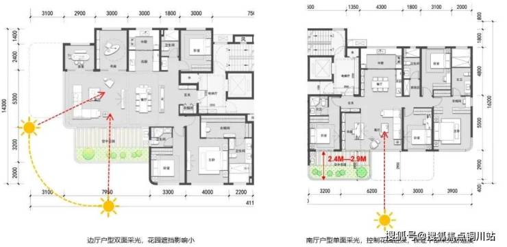 143平与171平南厅户型,主卧270度弧线落地窗。171平边厅户型,双边视野;191平户型,三边视野。