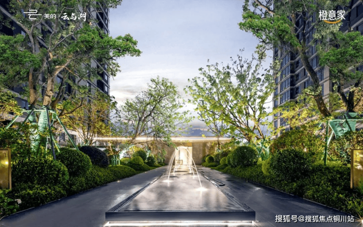 穿过社区大堂,迎面而来的,是中轴空间迎宾水景,灵动的喷泉,有如跳跃的音符,伴着潺潺的水声,欢迎各位业主回家。入口水景有着引财入户的美好寓意,两侧的精致特选乌桕树,形成犹如宫廷仪仗般的场景。