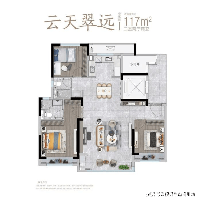 现在市面上建面约106㎡户型,做三室两卫的比较少,做出横厅的更罕见!这凸显出美的云与湖得房率高的优势。双卫生间,能满足两孩家庭、三代同堂的起居需求。约4.2m横厅,扩大了室内的采光面,同时也让客厅活动空间得以延伸。