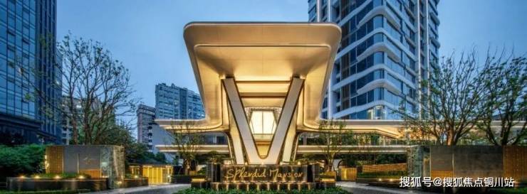 门头宽约26米,高约9米,以银白色铝板作为基底,以黄古铜不锈钢线条勾勒出大V造型,与丛生香樟、价值几十万的罗汉松、跌水涌泉形成呼应。