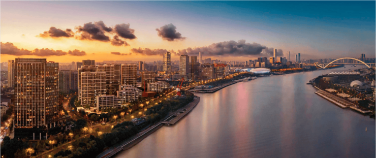 【保利世博天悦】容积率2.0,绿化率35%。西侧沿江布置6栋8层住宅(其中靠世博大道5栋为保留建筑),东侧沿雪野路布置19~22层住宅,形成西低东高两道天际线,最大程度利用江景资源。