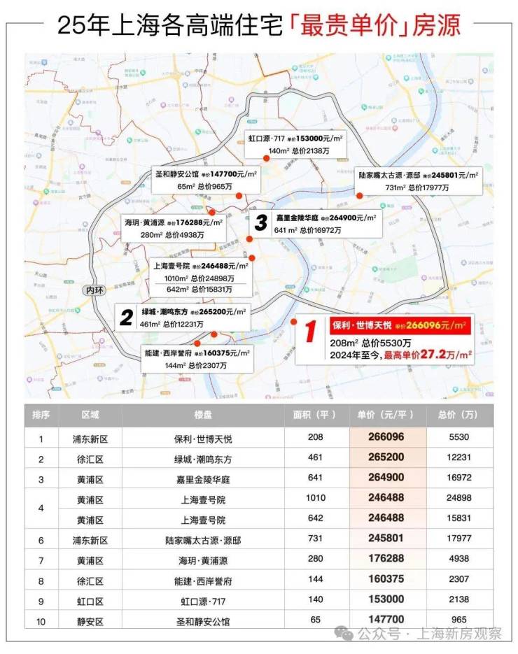 2025上海豪宅单价超20万/m²的成交量排行中,保利世博天悦甚至力压新天地、外滩、陆家嘴、苏河湾、徐汇滨江等一众热门板块新盘,问鼎上海豪宅之巅!