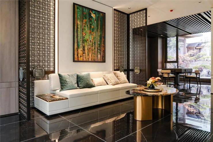 并且中式园林里常用到的框景,也展现得淋漓尽致,透过放大的窗框,仿佛在看一幅四季山水画卷。