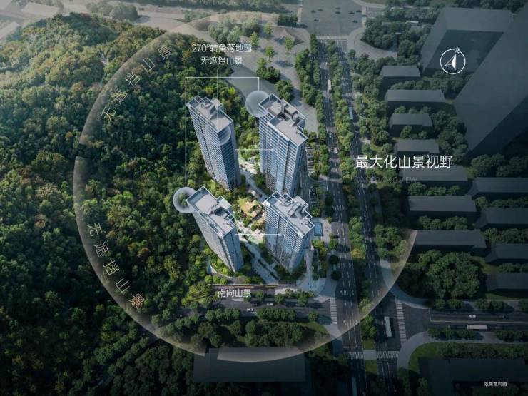 而最终的效果也造就了,整个社区绝大多数户型能够享有山景,你的窗外不再是密密麻麻的建筑,而是近处的自然绿意和远处的城市繁华。