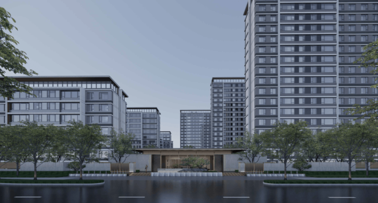 项目采用公建化外立面,屋顶形体融入山峰概念,结合江南古建筑标志性符号飞檐,化繁为简打造横向飘檐,用黄金比例勾勒出了一个庄重大气,又极具尊贵的高级质感。