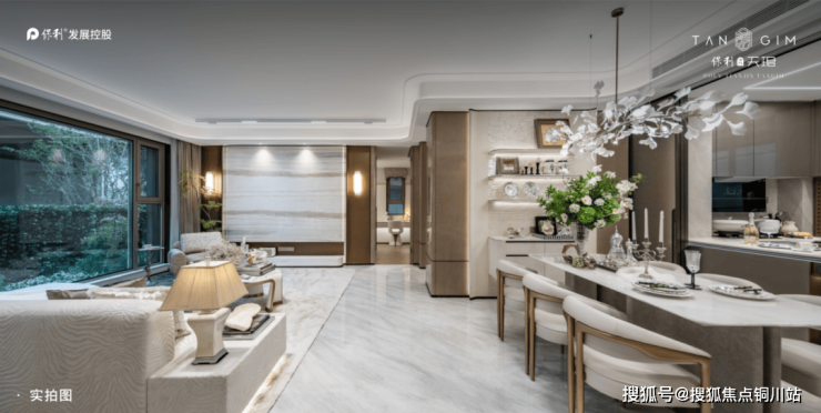 客厅面宽4.5米,进深3.1米,南向有0.6米的飘窗,实际上是4.5米的方正空间,精装交付的电视背景墙装饰镜湖春晓同款岩板,局部装饰铜线条,日常生活完全可以在沙发背后放一组通高书架,白色调为主的精装空间感受很开阔。很多改善盘小户型背景墙只用仿石瓷砖通铺,保利津门天珺明显在核心点做了级配拉升。