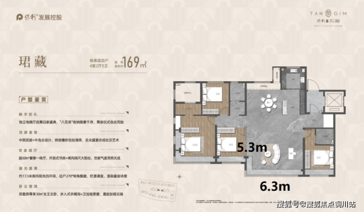 169户型没有样板间,但必然是靠抢的产品,只有18套,更重要的是天津市场上唯一以169㎡做到四房三卫双套房宽厅的产品。面宽6.3米,南向三个卧室最小面宽都在3.2米以上,主卧卫生间更是奢侈到一间次卧的尺度,实得房率高达97%。随便一组数据都能冲击市场,更何况作为整个项目的压轴产品,精装标准是天系塔尖。如果在河西买改善,洋房、大尺度、高标精装这个户型绝对是不二之选。