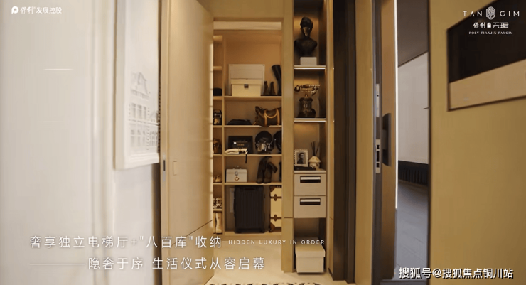 入户是贯通梯双侧对开,电梯前室有个超长空间,一组通顶收纳柜,小孩的玩具车,雨具,不常穿的鞋子,甚至是快递台,空间足够想象。入户后是一组玄关柜,内外形成脏净的双玄关格局,实用型与私密性齐备。