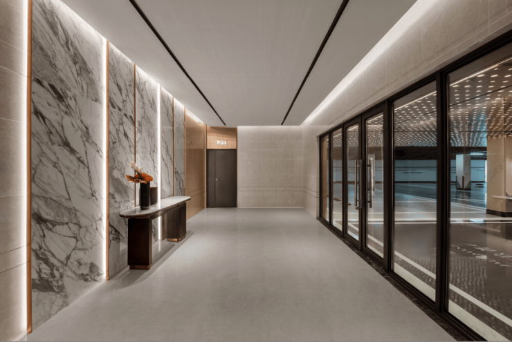 地下两层和地上均采用精装大堂设计,地下入户大堂高达惊人的4.15米,以高档岩板作为背景,增强整个墙面质感。