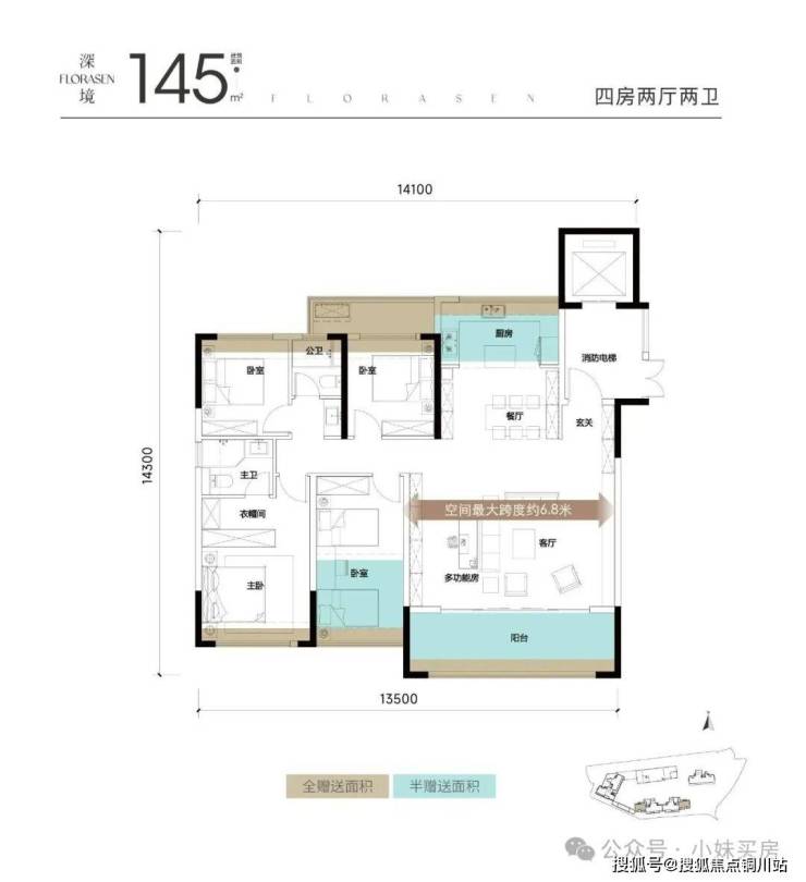 ④户型设计合理,100平配置双阳台设计,125平实现独梯入户,得房率最高可达约105%