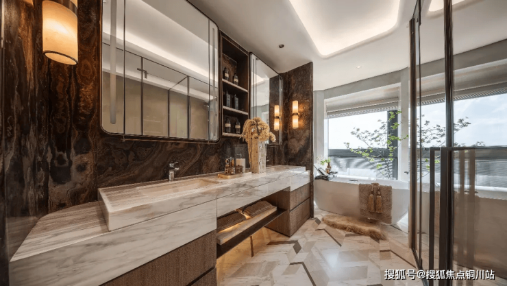 南向景观主卫精心选用产自加拿大的奥巴马乱纹与产自意大利的卡里冰玉石材,作为墙面基调展开设计,地面采用三色石材拼花图案,带来媲美总统套房的享受。