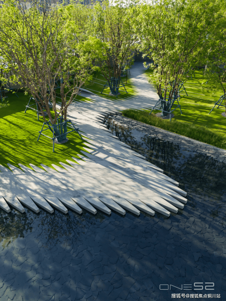 庄镇光深谙“自然高于装饰”的哲学,从唐诗宋词中萃取「雾影、晚枫、曲游」等 16 个主题庭院,如「晚枫」庭院以丛生枫树为主题树,两条滨州青玉带水景贯穿其间,再现「明月松间照,清泉石上流」的意境;「曲游」庭院铺就自由曲线步道,两侧丛生乌桕与元宝枫形成天然遮阳伞,铜质跑道标识在傍晚泛着暖金色,恰似「把夕阳裁成了铺路石」......