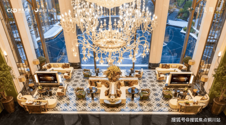 建发·璟玥会所大厅里,南洋菱形釉彩地砖、珐琅彩玻璃搭配舒服养眼。
