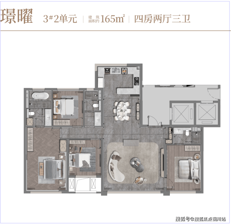 165户型做到了四开间朝南、整体17米的南向面宽。轻松PK目前市面180平米大平层。