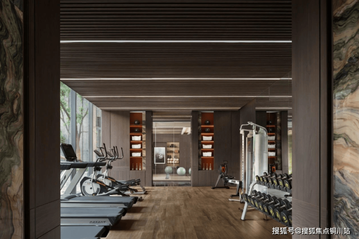 业主的归家大堂整体采用宝格丽式酒店风格,实景带有下沉式庭院空间,规划了健身房、瑜伽室以及书吧等。