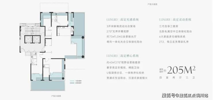 205平方米的户型,项目首次引入郑州的主卧套房双全景舱户型,双面采光带来超级居住享受;南北两侧设置浮岛式立体绿化阳台,与敞阔宽厅、主卧套房贯通,更大限度改善和满足采光通风和居住尺度需求。