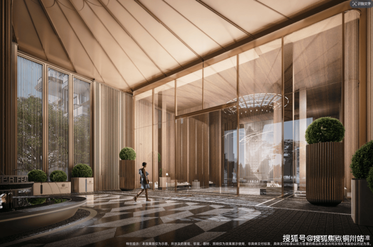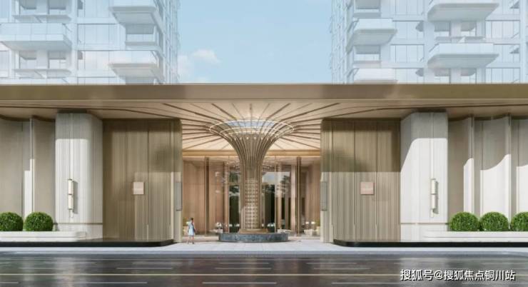 社区主入口大门宽度超80米,大门超级界面宽度超120米,高9.9米;采用三层递进式设计:首层香槟金金属格栅(3段),中层仿石铝板(6段),外层浅色格栅(9段)。3-6-9的倍数序列暗含道家"三生万物"的哲学意境。