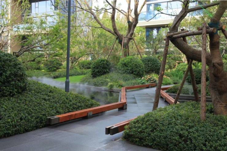 由动至静的流线型水景,住区入口为起点,一路顺流而下,形成一条贯穿整个林间的水景丝带,线条流畅自然,与周边场地道路、地形植被交错掩映。极简的镜面水景结合丰富绿植,潺潺跌水为溪流注入活力。池底为防止返碱采用胶泥薄贴,整体铺装完成后所有铺装缝为防止返碱积灰,采用黑色填缝剂进行填缝施工。