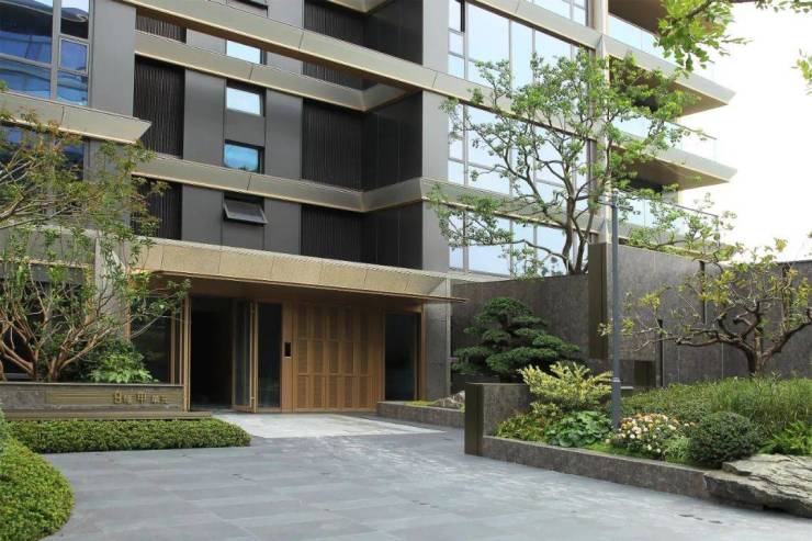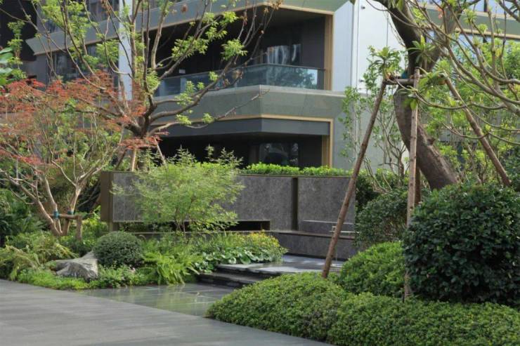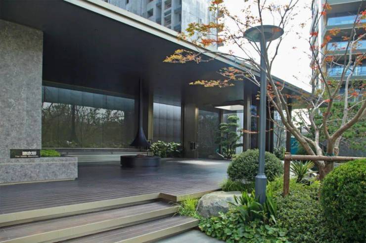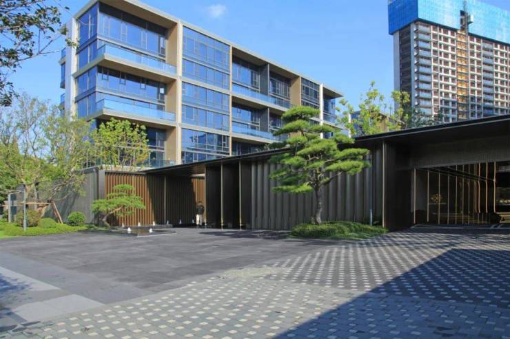景观施工整体铺装轴线与门楼、汽车坡道精装共同放线确认,施工过程中统一按照确认轴线放线施工,防止施工过程中方向偏位,线接口出现偏差。入口映入眼帘的是一高一矮两棵造型飘逸进口黑松,松与水景相映成趣,穿行而入,围合空间内山石小景与精致的格栅背景墙完美融合,开启愉悦的归家之旅。