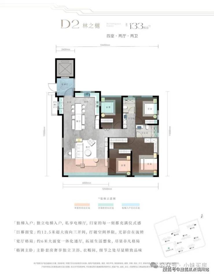 D2户型(建面约133㎡,四房两厅两卫):南向总面宽达到12.5米,三开间朝南,无论是客厅还是卧室,都能享受到充足的采光与视野;约6米大面宽一体化通厅,空间感拉满;四个卧室尺度均衡,主卧带独立卫浴+衣帽间,三个次卧可分别做儿童房、老人房、书房,完美适配多孩家庭、三代同堂的居住需求。