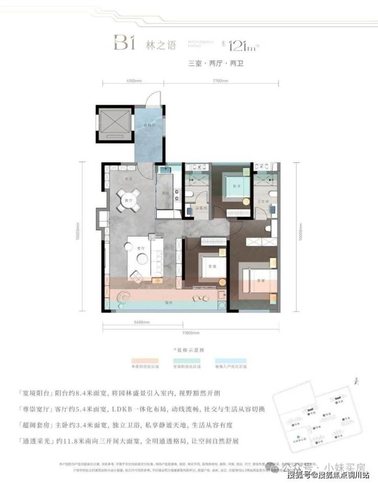 B1户型(建面约121㎡,三房两厅两卫):客厅面宽直接拉到5.4米,搭配约8.4米南向贯通式阳台,在121㎡面积段里做出了140㎡+的大平层既视感,LDKB一体化布局让公共空间完全通透,社交、生活场景自由切换;约11.8米南向三开间,全明通透无暗房;主卧面宽约3.4米,带独立卫浴+步入式衣帽间,兼顾功能性与仪式感。