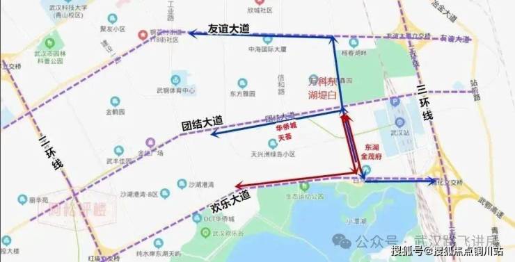 华侨城天荟位于洪山区团结大道与信和路交汇处,在二环与三环之间,与二环直线距离约3.5公里,与武汉站直线距离约1.2公里,属于洪山区洪山北板块,又属于杨春湖高铁商务区范围,紧临团结大道和地铁4号线工业四路站。