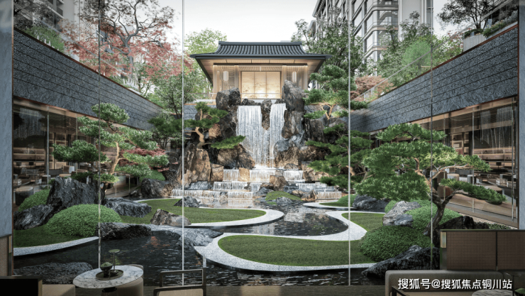 迎面的玻璃幕墙如同画框,背后下沉庭院的山水景致映入,恰似仇英名画《高山流水》悬于墙面。