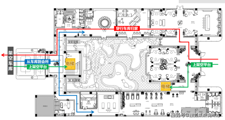 会所东、西侧设置了两部电梯,你从大堂进入,可乘梯上架空层顶,再穿「超级中轴」从首层入户大堂归家。