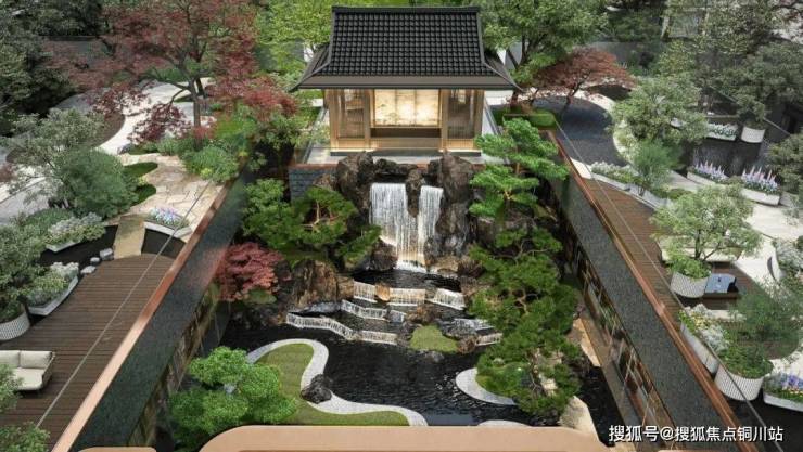 正中耸立着中式观瀑亭「风雅堂」,两侧护栏旁设置休闲座椅,让你可以在不同位置俯瞰下沉庭院的精妙。