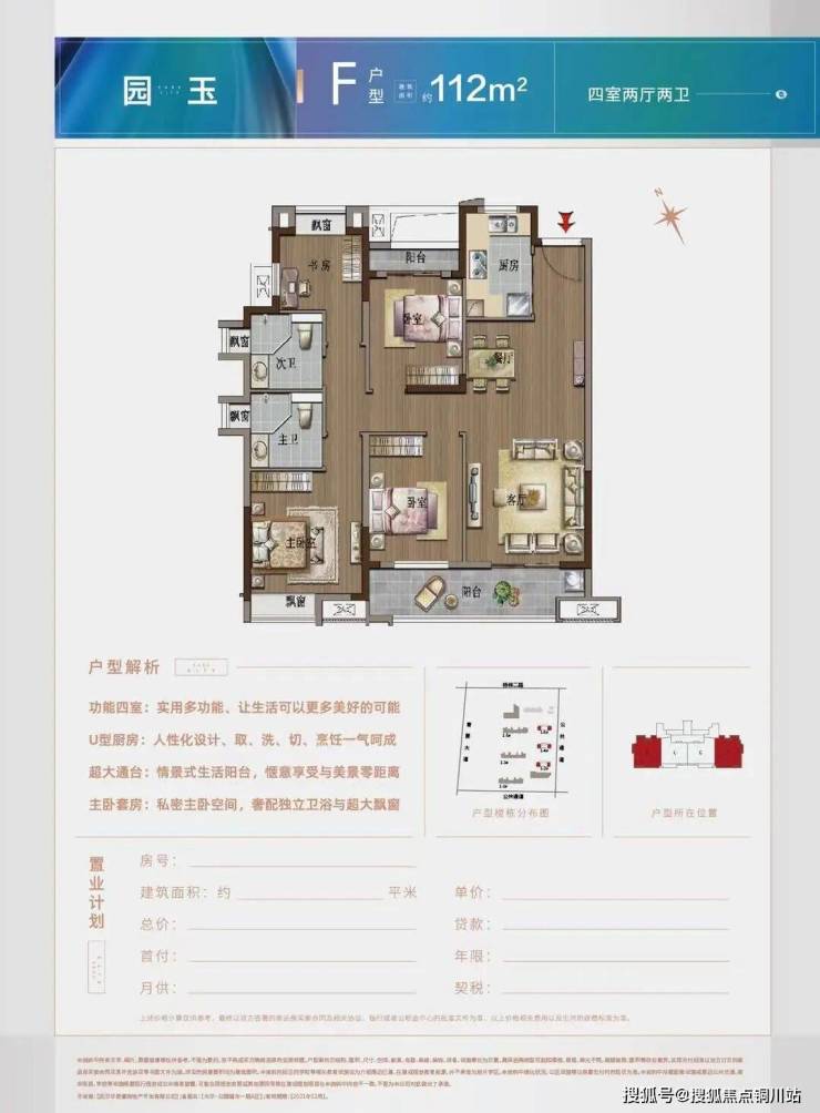 建面约112平的F户型,四房两厅两卫,此户型位于2号楼的边户,112平也能做到南北双阳台;两个卧室带阳台,一间为北向次卧,一间为南向客厅延伸到次卧的大阳台,主卧和书房也赠送飘窗,就连两个卫生间,都有赠送的飘窗,所以实得面积大,得房率高。