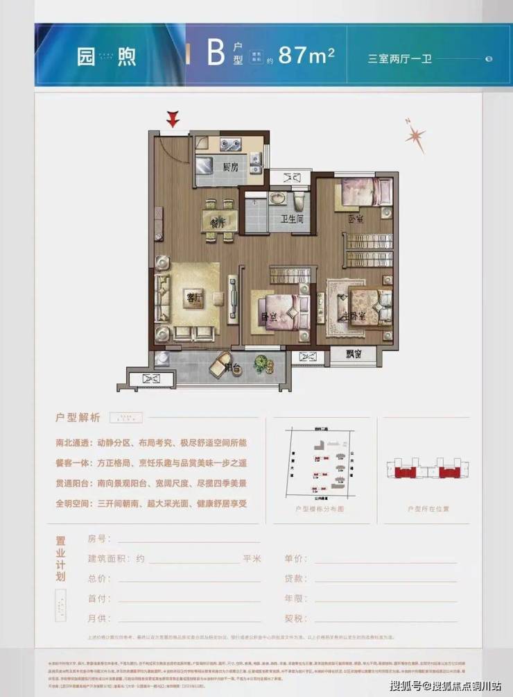 建面约87平的B户型,三房两厅一卫,此户型位于3号楼的中间户。87的建面做了三房,功能性很强。户型方正,客餐厅一体,阳台从客厅连接到次卧,主卧带一飘窗,整体也是南北通透的设计。