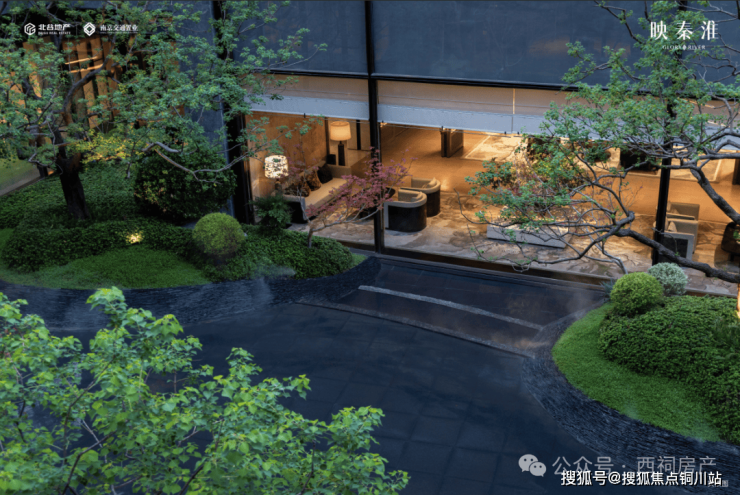 1、约1000方的下沉式庭院,透过会所大幅落地玻璃窗,让所有人共享 “江南四季景”。乌桕红枫、景石叠瀑,天光树影交织成诗,水声清风不疾不徐,就连每一株树的姿态都极富禅意。