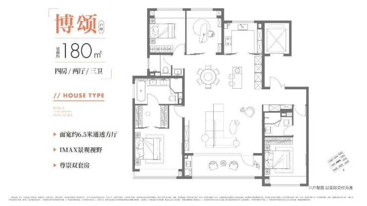 再来看建面约180㎡大平层户型,这款户型地处楼王位置,只有一栋楼有,南向正对着中央景观,视野绝佳,是真正的终极改善户型。