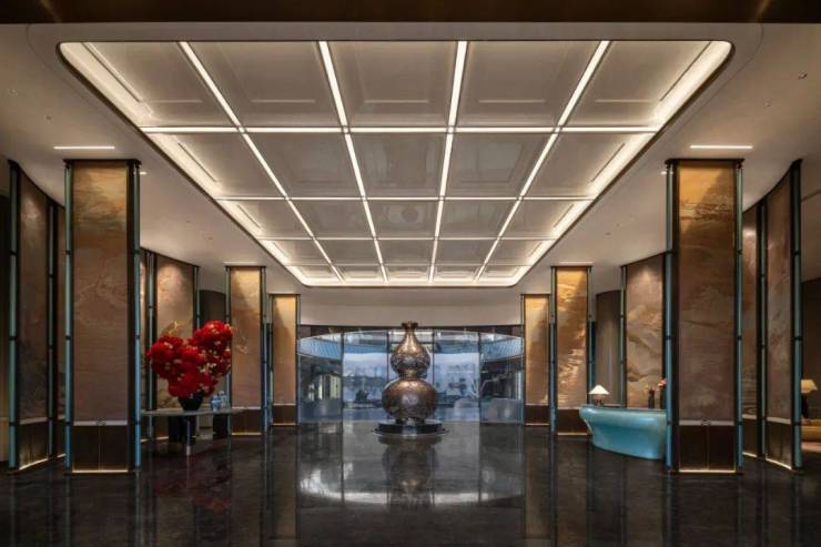 大面积的LOW-E玻璃钻感天幕,让270°的环幕窗景视野,收纳一城峯光。再搭配金色铝板线条,打造镜面感建筑立面,意自东方的气韵与层层描金的典雅,时刻辉映着沙湖如画美景。