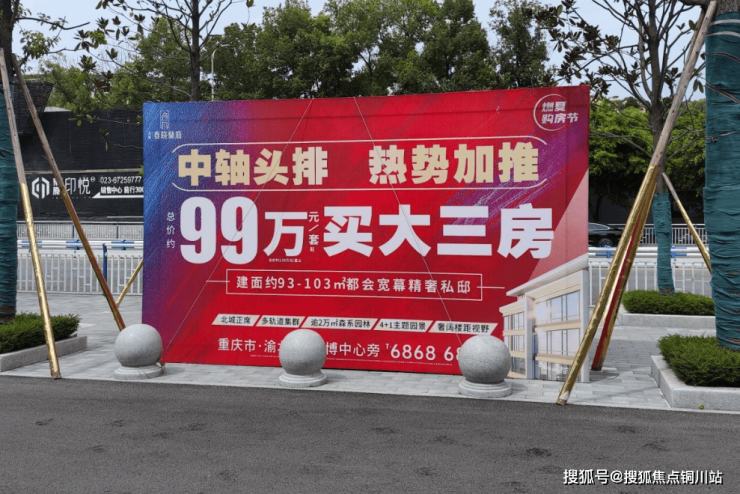 只见马路旁边张贴着大大的海报:“99万元/套、买大三房”,十分地吸引眼球,现场就能看到不少购房者往售楼部跑。