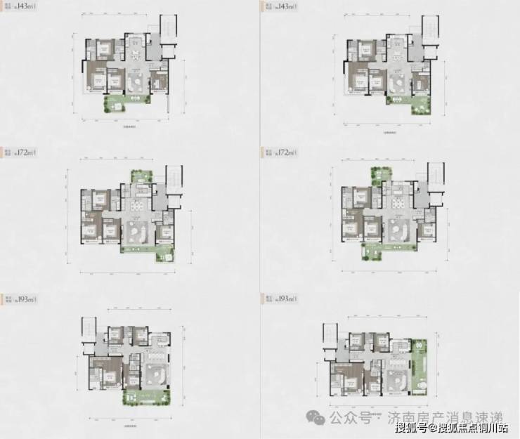 项目最小户型为143㎡四室两厅两卫,主卧均为L型拐角飘窗,济南市场上类似尺度的户型基本上都得155㎡以上