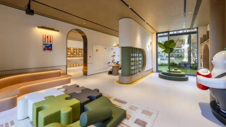 架空层不同楼栋功能不一,有健身房、瑜伽室、书吧、儿童游乐区,后期还在考虑引入适老化设施,并且贴心地设有地暖和空调。