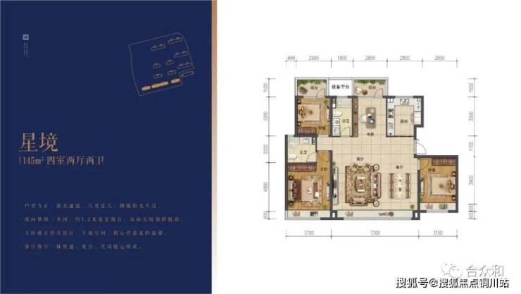 145平,元宝户型。客厅开间7.2米,得房率约82%。