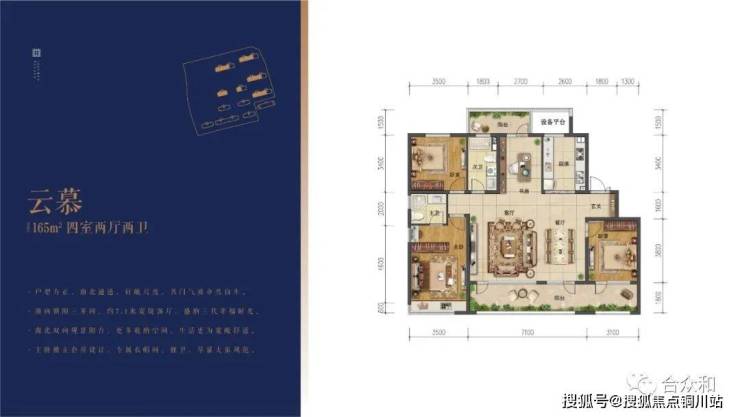 165平,元宝户型。客厅开间7.1米,南北双阳台24平,得房率约82%。