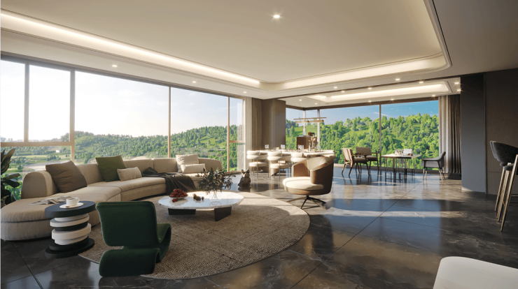 约42.35米的采光周长:此户型做到了真正的三面采光,且采用了大量全景落地窗设计,包含南向约15.5米的全屏开间、西侧约14.5米的广角式采光面及北侧约12.35米的景观视野,最终可实现约42.35米的采光周长。