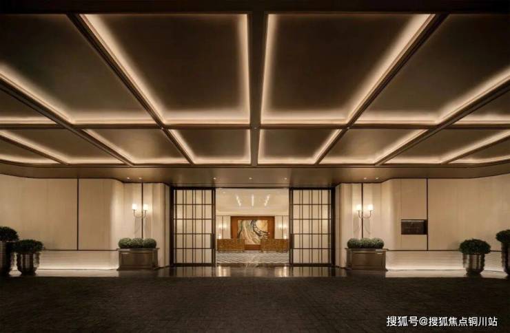 步入门庭,云石吊顶之下,借鉴中国古代建筑中的“藻井”做法,由522片皇家白玉石材拼接而成,凝聚光华,辉映时空。华光之下,中心水池承托起艺术雕塑,莹润皎洁,宛若珍宝。