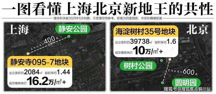 上海静安寺地块,体量迷你且界面一般,但直线距离静安公园约400米、容积率仅约1.44,所以地价高达16万/㎡+,资本仍趋之若鹜;北京海淀树村地块,直线距离圆明园约600米,容积率低至约1.6,房企不惜鏖战270轮+、以10万/㎡+地价夺得。