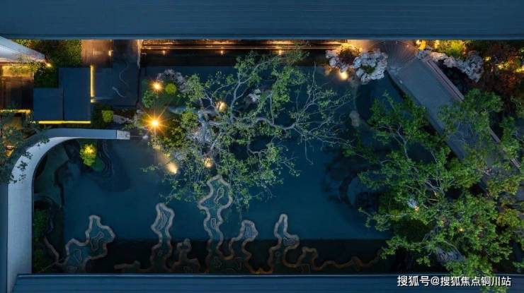 迈入归家仪式感极强的府门,呈现“门—廊—庭”三进递进礼序,一方金山龙池,以《研山铭》为蓝本,以石为云根、金为玉边,呈现“金镶玉”的铜艺肌理与奢石交相辉映,仿佛让人置身于一个充满诗意和艺术的世界。