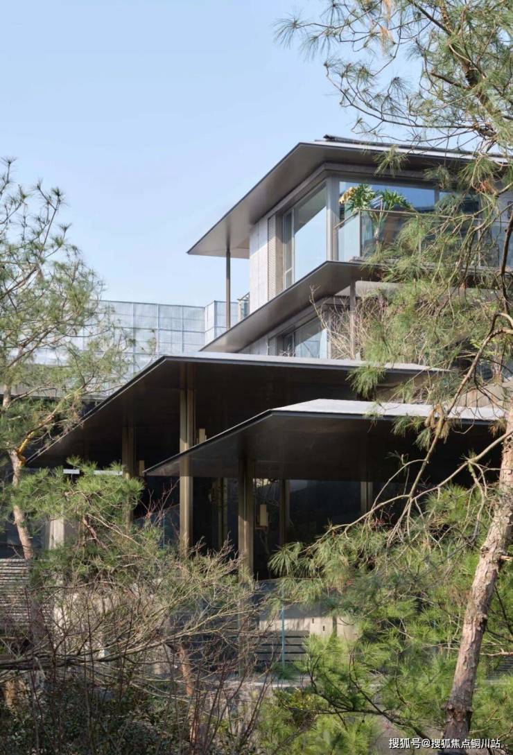 除此之外,“柱、栏、屏、帘、榫”这些耳熟能详的东方古典建筑符号在凤栖逸庐得到了绝好的现代化转译,并大面积铺陈于建筑之上,让传统家园情怀妥帖安放,又平添现代摩登质感。